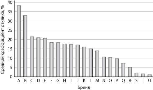 Мы считаем, что длина анкеты – это не самый лучший фактор прогнозирования коэффициента отклика. На рис. 5.3 показано его распределение по ряду В2С-брендов при проведении интернет-опроса с использованием анкеты из двух вопросов. Эти данные демонстрируют отсутствие однозначной корреляции между длиной анкеты и коэффициентом отклика. Важно помнить, что коэффициент отклика – только один из факторов, которые необходимо учитывать при определении длины анкеты. Не менее важна и постановка вопросов, имеющих отношение к вашему бизнесу, и наличие ресурсов для проведения опроса, и цели использования полученных данных.