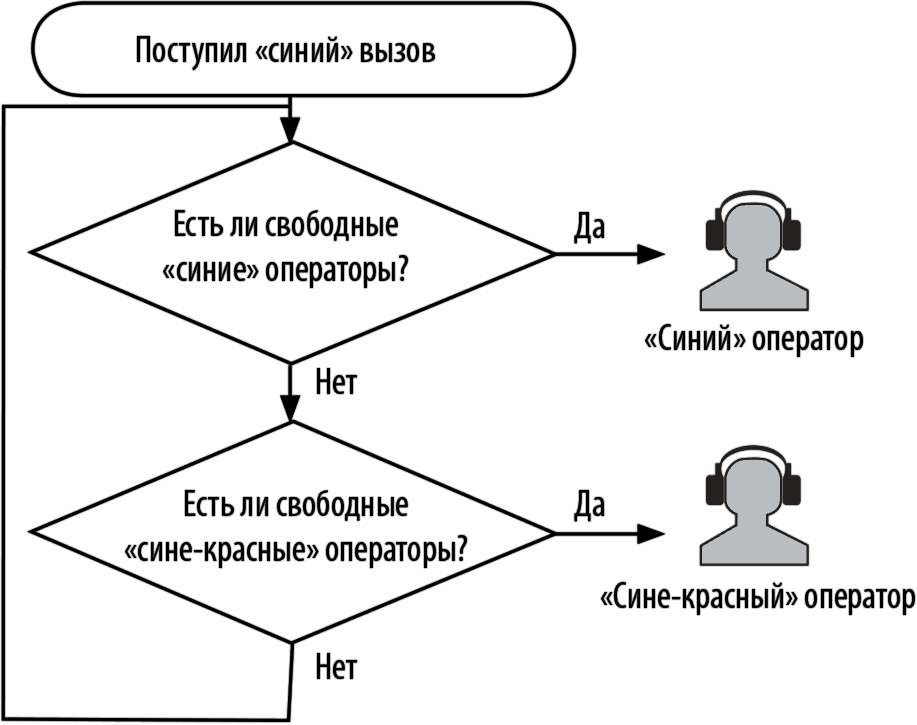 В простейшем виде обе эти потребности сначала удовлетворялись следующим образом. Операторы обладали одним квалификационным признаком и, соответственно, могли входить только в одну группу приема вызовов. Предположим теперь, что у компании имелись две категории клиентов. Обозначим их условно как «красные» и «синие». Соответственно, образовывались две группы операторов: первая, «красная», обслуживала вызовы «красных» абонентов, вторая, «синяя», – «синих». Также имелись два телефонных номера: один для «красных», другой для «синих». «Синие» набирали свой «синий» номер и сразу попадали на группу «синих» операторов. То же самое – для «красных». Все четко, ясно, прозрачно. Никакой путаницы.