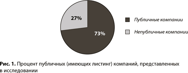 Объектом исследования стали 100 компаний – российские акционерные общества, как публичные (73 %), так и непубличные (27 %), работающие практически во всех ведущих отраслях промышленности и финансовой сферы (рис. 1 и 2). Особое внимание уделялось изучению корпуса независимых директоров (225 директоров, занимающих 256 директорских позиций).