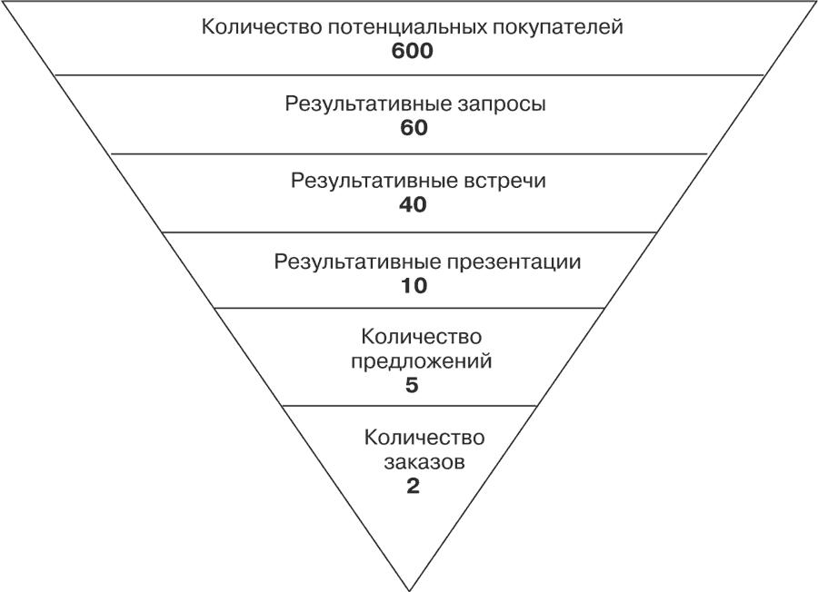 Естественно, выход «готовой продукции» (в данном случае под продукцией понимается и обещание, и договоренность о следующей встрече, и протокол о намерениях) на каждом этапе не может быть 100 %-ным, обязательно есть потери. Мы должны понять, где эти потери носят объективный, а где субъективный характер и как можно повысить КПД (коэффициент полезного действия) на каждом этапе. Например, в «воронке» продаж, изображенной на рис. 2.9, 600 потенциальных клиентов приводят к 60 результативным запросам. Хорошо это или плохо – 1 из 10? А как у конкурентов? Что мы можем сделать для повышения эффективности этого этапа? Может быть, изменить систему отбора потенциальных клиентов, или переделать информацию для рассылки, сделать ее меньше, точнее и жестче, или более активно сопровождать все рассылки звонками конкретным менеджерам?