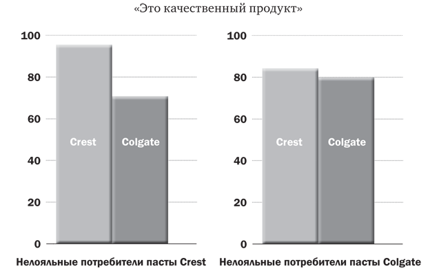 Покупатели и Crest, и Colgate считают обе зубные пасты продуктами должного качества – так и должно быть, поскольку эти продукты тщательно изучены и производятся по всем правилам. Те, кто покупает пасту Colgate (и помимо нее часто приобретают зубную пасту других брендов), несколько больше склонны ставить качество Colgate выше, чем нелояльные покупатели Crest.