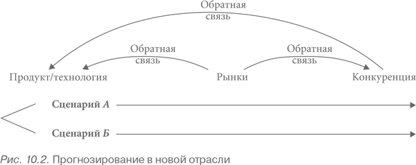 Для новых отраслей особенно полезным инструментом может служить метод сценариев. Сценарии представляют собой дискретные, логически согласованные представления о будущем, отобранные с учетом вероятности и отражающие спектр возможных итоговых состояний объекта. Примерное использование метода сценариев для прогнозирования новых отраслей представлено на рис. 10.2. Исходным моментом прогнозирования является оценка будущей эволюции продукта и технологии по таким параметрам, как стоимость, многообразие, технические характеристики. Аналитик должен отобрать небольшое количество логически согласованных сценариев, отражающих развитие комплекса «продукт/технология» и охватывающих вероятные итоги этого развития. Затем по каждому из этих сценариев аналитик разрабатывает свой сценарий, описывающий будущие рынки, их размер и характеристики. На этом этапе вступает в действие первая обратная связь, поскольку характер первоначальных рынков может оказать влияние на дальнейшую эволюцию продуктов и технологий. Аналитик должен включить это взаимодействие в сценарии, используя итеративный метод.