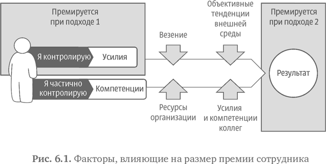 Я сам – очень мягкий и склонный к популизму руководитель: если я знаю, что сотрудник ждет премию в 100 руб., я постараюсь дать ему 110. Я никогда не иду против чувства справедливости самого сотрудника – для меня важно, чтобы он сам считал свою премию справедливой. Есть небольшое число подчиненных, которые сами предлагают мне подход номер один – говорят: «Давай сейчас, в начале года, ничего определять не будем, а в конце года ты сам решишь, какую премию мне дать. Я верю, что ты сделаешь это справедливо». Однако большинство все же предпочитает формулу. Интересно, что в моем конкретном случае чаще выигрывают первые: формула обычно оказывается жестче, чем мое субъективное решение. Когда есть формула, я развожу руками и говорю: по формуле получается так, дать больше не могу. А без формулы я иду навстречу ожиданиям сотрудника. И тем не менее, даже догадываясь о таких моих особенностях, сотрудники хотят формулу, потому что формула дает иллюзию прогнозируемости, иллюзию того, что ты ни от кого не зависишь и все в твоих руках. Это происходит вопреки тому, что, как показано на рис. 6.1, результат всегда определен рядом факторов, лишь часть которых контролируется человеком (и то не полностью), а многие и вовсе находятся за пределами его контроля.
