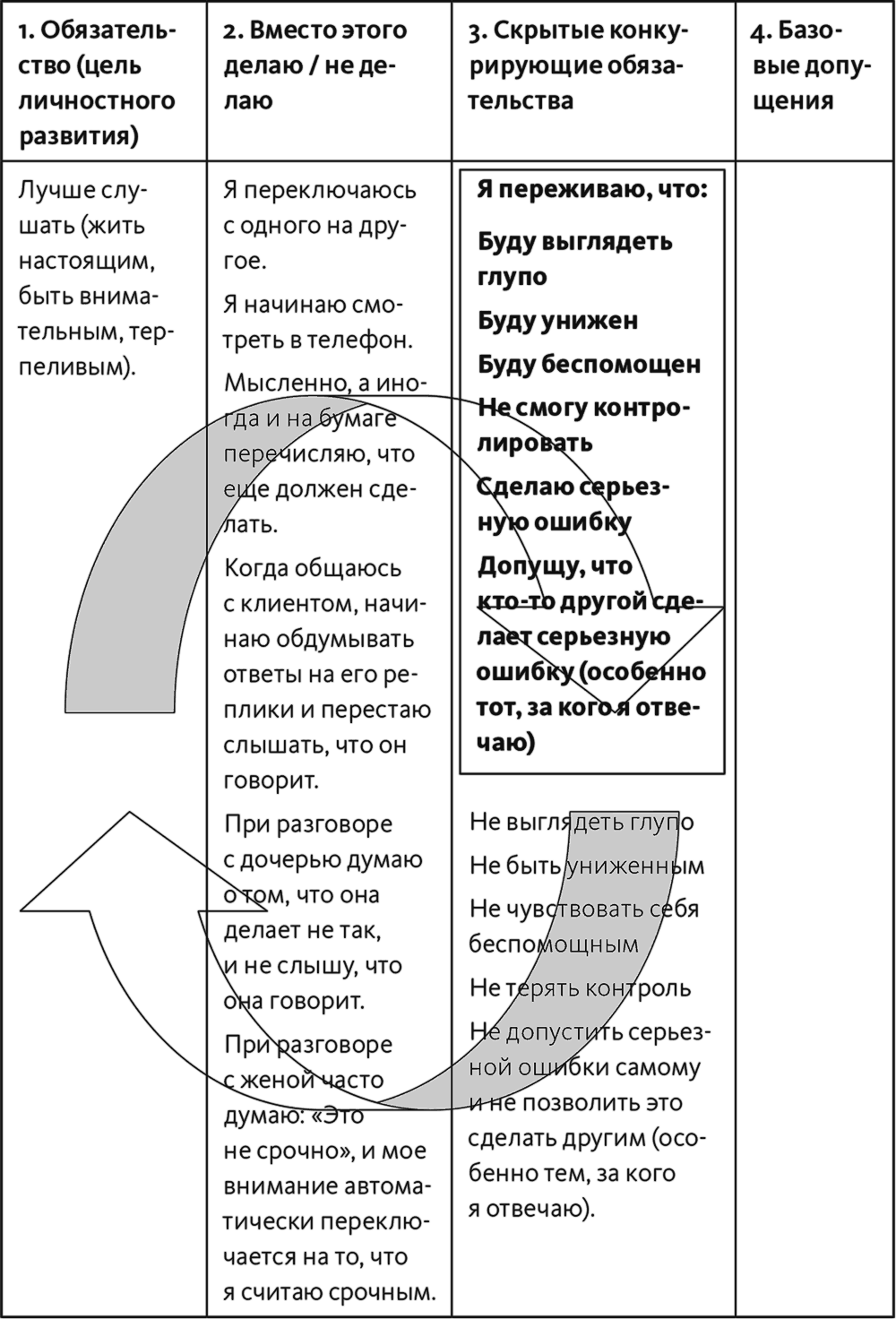 Читать дальше, пока вы не заполнили колонку 3, смысла нет. Уже готово? Теперь у вас есть какое-то представление об иммунитете к изменениям? Оно вас интригует? Обратите внимание на то, какие вопросы мы не задаем. Мы не спрашиваем, удалось ли вам что-то изменить. Вам и не должно так казаться. Мы не спрашиваем, рады ли вы этому. Нравится ли вам узнавать, как устроен ваш иммунитет? Обычно никому не нравится.