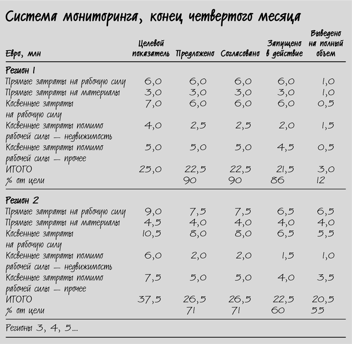 Большинство остальных регионов в целом не уступали региону 1, поэтому мы уверенно шли к достижению поставленной цели: к концу четвертого месяца мы вышли на уровень 70 %+ от запланированного объема экономии и сделали хороший задел для достижения 80 %+ в течение следующих двух месяцев. (Как видите, затраты – коварная штука: ваши изначальные грандиозные цели снижаются естественным и неуловимым образом.)