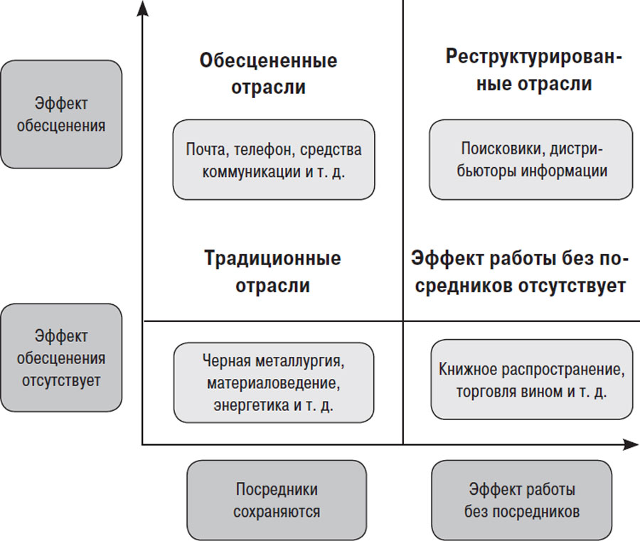 • Традиционные отрасли. Не наблюдается ни эффекта отказа от посредников, ни эффекта обесценения. Это такие отрасли, как черная металлургия, производство или продажа материалов, энергетика и т. д. Интернет не затрагивает эти отрасли в том, что касается создания стоимости, даже если их сотрудники обмениваются электронными письмами и отслеживают состояние рынка через те или иные сайты. Сюда входят предприятия, занятые выпуском тяжелой (в смысле веса) и дешевой (в пересчете на килограмм) продукции. Но такие традиционные отрасли, как энергетика, должны сохранять бдительность, поскольку информация может представлять собой ценность, например позволяя экономить энергию.