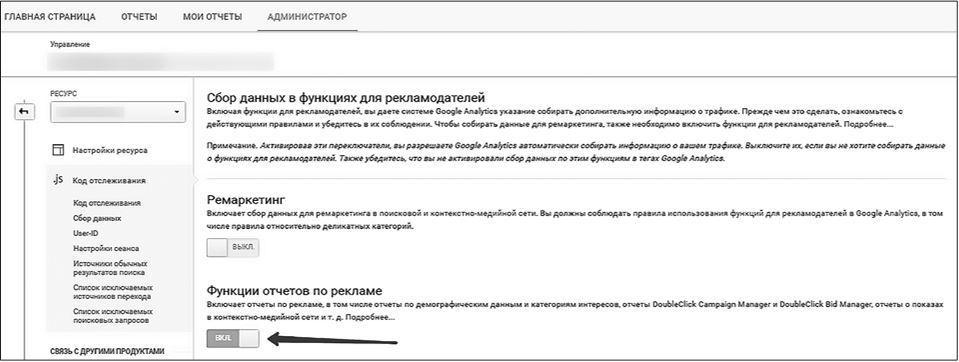 • данные из Google Analytics и «Яндекс. Метрики» (в первую очередь вам понадобятся данные о демографии, географии и устройствах; если получится выудить больше информации — отлично); чтобы полноценно пользоваться этой функцией, в Google Analytics нужно зайти в меню «Администратор», в колонке «Ресурс» выбрать «Настройки ресурса», а затем «Сбор данных»; в появившемся меню включить «Функции отчетов по рекламе» (рис. 2.33);