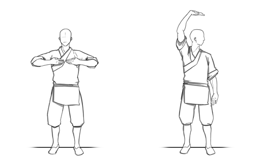• На выдохе вытяните правую руку вверх, ладонь смотрит наверх. Левая рука остается внизу ладонью вниз. При этом поверните голову налево и посмотрите через левое плечо.