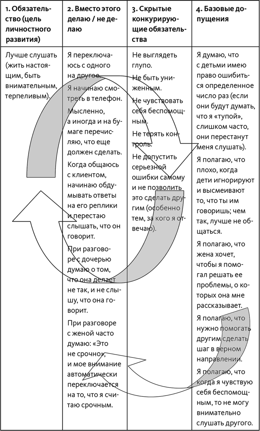 • Понятно, как каждое из базовых допущений, принятых за истину, формирует одно или больше конкурирующих обязательств (например, если я, ошибившись, точно не смогу наверстать упущенное, мое обязательство не допустить серьезную ошибку вполне логично). Базовые допущения в целом делают обязательства из колонки 3 неизбежными, и так они поддерживают иммунную систему: скрытые обязательства возникают на основе базовых допущений и провоцируют поведение, которое мешает добиться цели.
