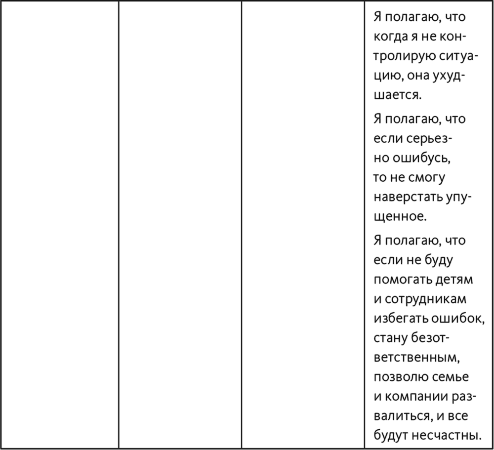 • Перед нами открывается большой мир, в который раньше нам нельзя было заходить. Базовые допущения – табличка «Опасно! Не влезай!» на дверях в новый мир («Я мог бы, хоть теоретически, шагнуть в мир, где не могу все контролировать, чувствую себя беспомощным. Я мог бы шагнуть в мир, где не лезу с советами, когда меня не просят, мои дети более снисходительны, чем я себе воображаю», и т. д.). Нельзя исключать, что предупредительный знак вполне уместен и игнорировать его не стоит, но может случиться и так, что из-за собственных убеждений вы будете вынуждены тесниться в нескольких маленьких комнатах огромного особняка вашей жизни.