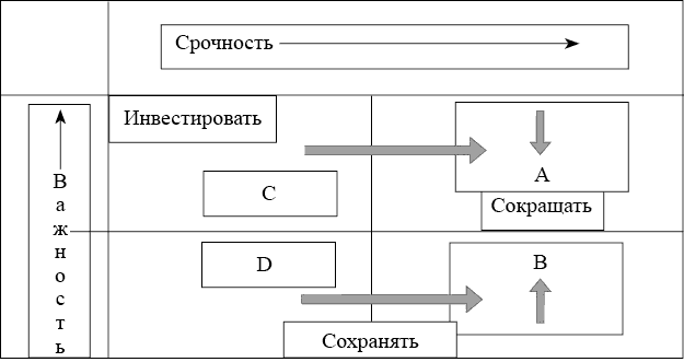 Рис. 8 демонстрирует модель расстановки приоритетов. «Важность» – оценочное измерение, основанное на важности факторов, описанных ранее. Степень «срочности» – это, по существу, временная шкала, на которой обозначено, что задание нужно закончить либо к конкретному сроку, либо ко времени, связанному с выполнением других задач. На каждой оси условно обозначен центр, для того чтобы выбрать язык (А, В, С, Д), с помощью которого мы можем трактовать различные типы задач. Важно не рассматривать отрицательную область каждого центра как «низшую»; имеет значение, скорее, то, какие задачи менее важны или менее срочны, чем те, что находятся в положительной области от каждого центра.