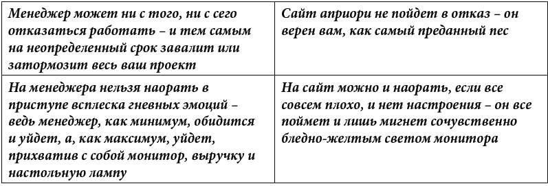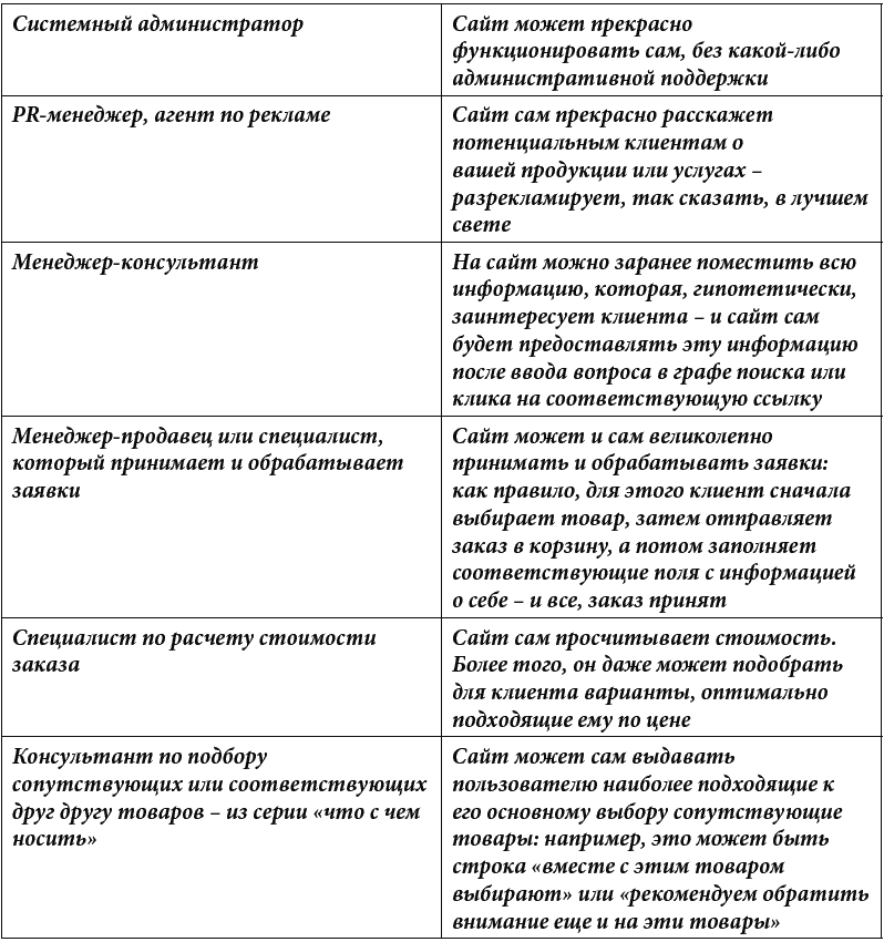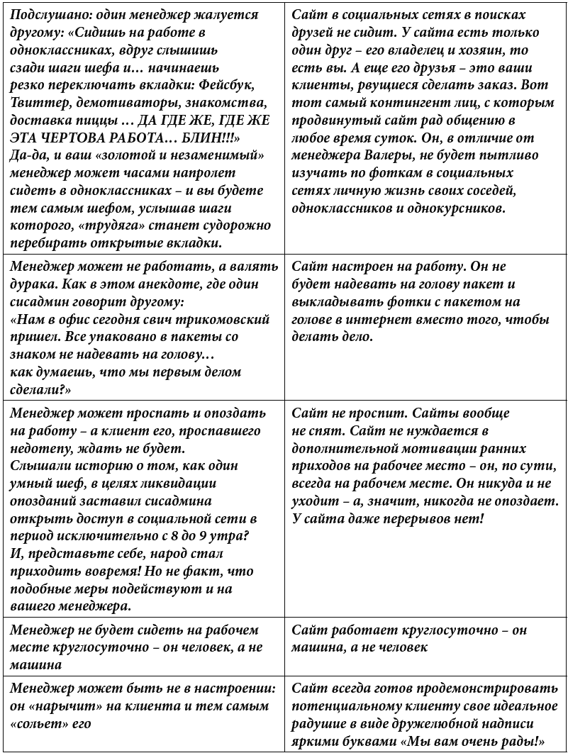 А следующая таблица – это возможные огрехи и «косяки» сотрудников, которые ваш продвинутый сайт никогда не допустит. Потому что сайт по определению запрограммирован помогать, а не «пороть косяки».