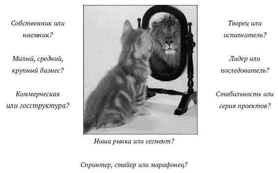 Картинка, где мирная кошка видит в зеркале льва, напоминает о том, что в бизнесе нельзя терять наглость хода. И ваш бизнес-образ должен внушать как минимум почтение и уважение.