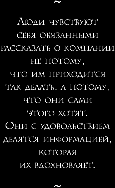 Люди чувствуют себя обязанными рассказать о компании не потому, что им приходится так делать, а потому, что они сами этого хотят. Они с удовольствием делятся информацией, которая их вдохновляет.