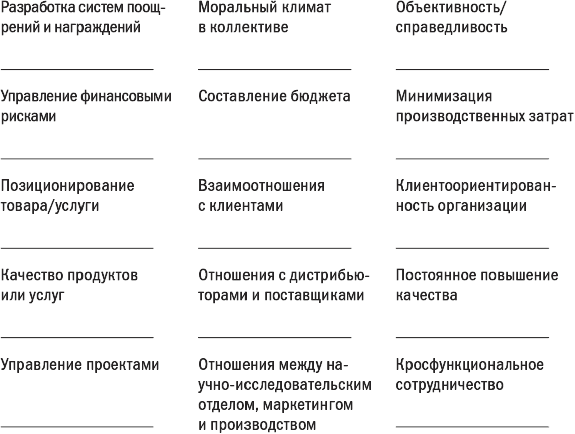 Табл. 1.1 – простой способ оценить ваши предпочтения. Заполните ее ячейки, оценив ваш истинный интерес к решению проблем в той или иной области. Например, насколько вы любите работать над системой поощрений. Не пытайтесь сравнить ваш интерес к той или иной области, просто оцените его по шкале от 1 (совсем не привлекает) до 10 (очень привлекает). Только помните, что речь идет о ваших истинных интересах, а не о способностях или практическом опыте.