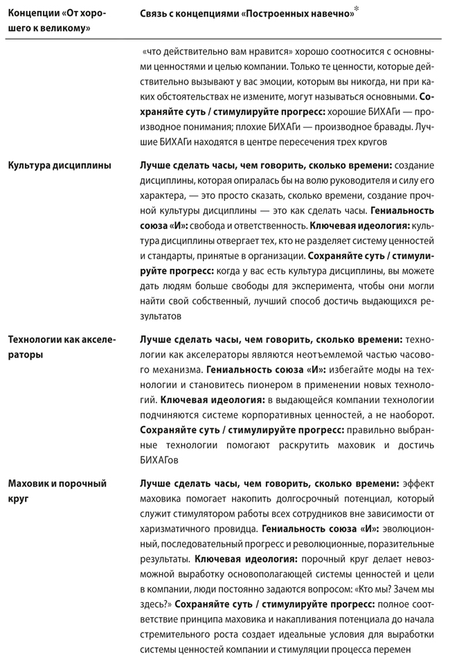 В таблице 9.1 показано, как взаимосвязаны две концепции. В общем, идеи, которые помогают перейти от хорошего к великому, создают основу для успеха концепций «Построенных навечно». Мне хотелось бы думать, что «От хорошего к великому» описывает концепции, которые позволяют маховику пройти этап наращивания потенциала и перейти к стремительному росту, в то время как «Построенные навечно» описывают идеи, которые позволяют ему катиться дальше в будущее, превращая компанию в символ долгосрочного успеха. Просматривая таблицу 9.1, вы заметите, что каждое из основных заключений «От хорошего к великому» дополняет и развивает все четыре ключевые идеи книги «Построенные навечно». Подводя итог, вот эти четыре идеи.