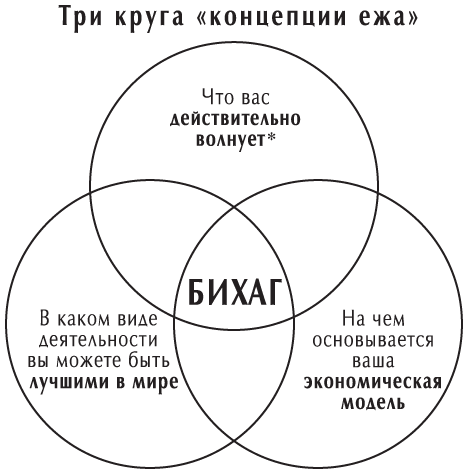 Я не собираюсь обсуждать все взаимосвязи в таблице 9.1, но хотел бы отметить одну особенно важную связь между БИХАГами и тремя кругами «концепции ежа». В книге «Построенные навечно» мы определили БИХАГи как основной способ стимуляции прогресса, который позволяет в то же время сохранить самое главное. БИХАГ – это колоссальная и смелая цель, гора, на которую надо взобраться. Ясная и понятная каждому цель. БИХАГ служит объединению усилий, укрепляя командный дух по мере того, как компания приближается к финишной прямой. Как лунная программа НАСА в 1960-е, БИХАГи захватывают воображение, очаровывают людей.