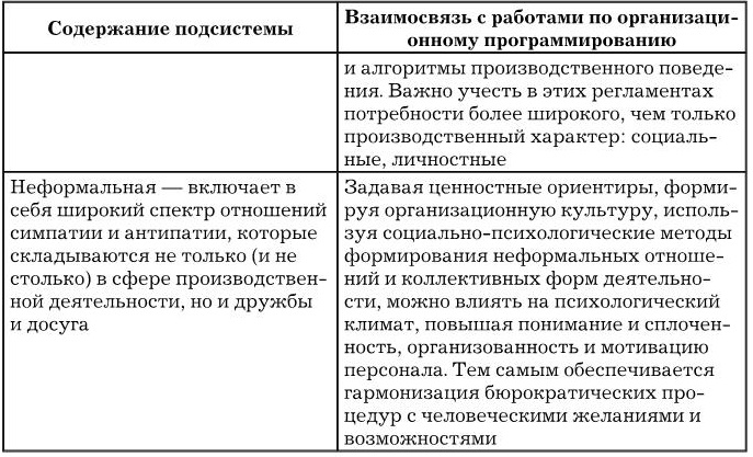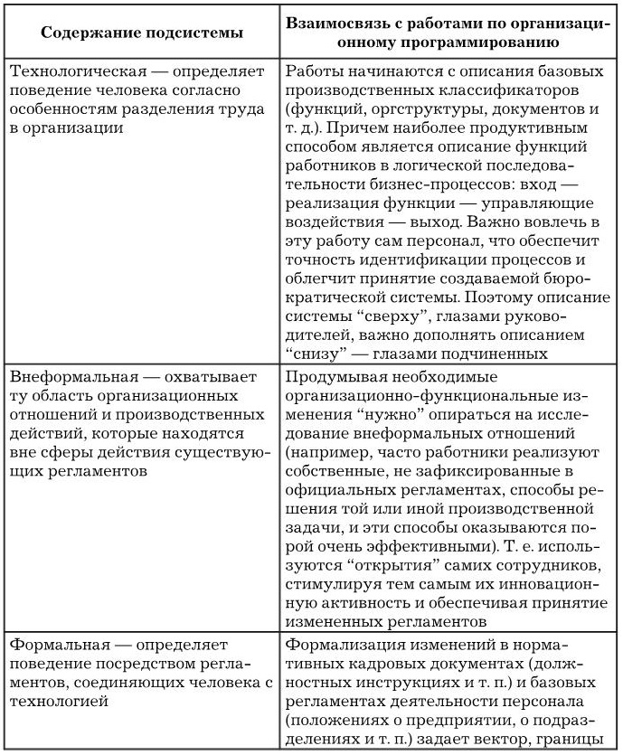 Организационное программирование, являясь бюрократической процедурой, тем не менее, должно опираться на жесткий (бюрократический) и мягкий подходы как в процессуальном, так и содержательном планах. В табл. 6 проиллюстрирована эта взаимосвязь через подсистемы организационного поведения, выделенные известным исследователем Р. Дабиным.