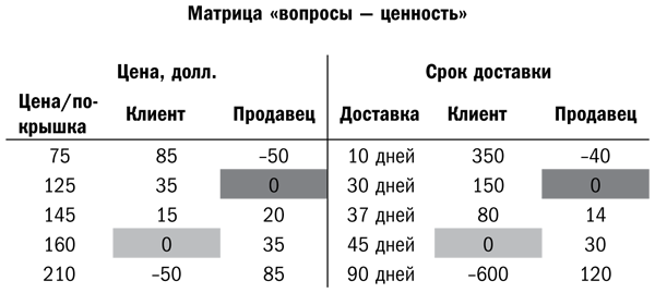 Эта асимметрия в оценке срока доставки меняет общую ценность различных комбинаций цены и даты доставки. Если взять в качестве отправной точку зрения дилера на цену и срок доставки, то получается, что из-за нового пожелания Томаса ценность срочной доставки перевешивает ценность, доступную в ценовом диапазоне. Вот как при этом будет выглядеть матрица «вопросы – ценность». Обратите внимание: отправная цена каждого вопроса для Томаса выделена серым, а для продавца – черным.