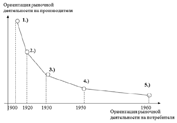 Рис. 1.1. Смещение вектора рыночной деятельности к потребителю в процессе смены концепций маркетинга: