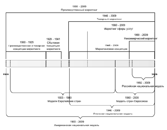 Рис. 1.3. Хронология концептуальных и национальных подходов всеобщего маркетинга С.П. Казакова