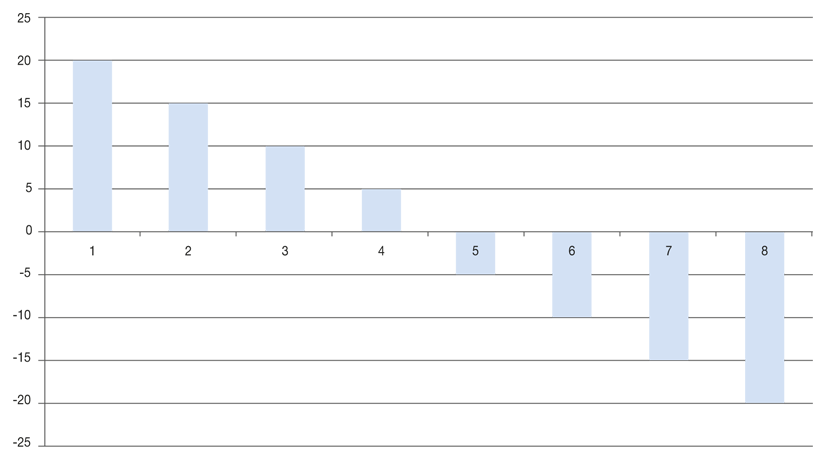 Вертикальная ось может представлять объем выручки или процент прибыли, а горизонтальная – номера, присвоенные определенным клиентам, магазинам, специалистам по продажам, продуктовым линейкам или товарам.