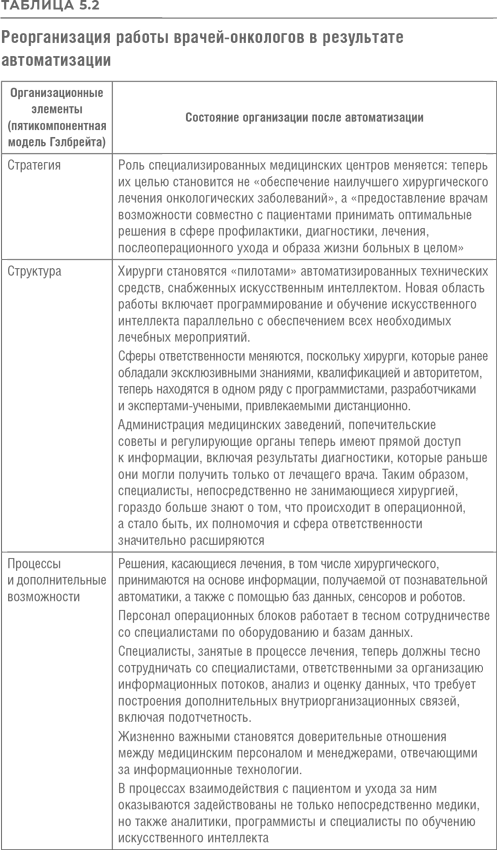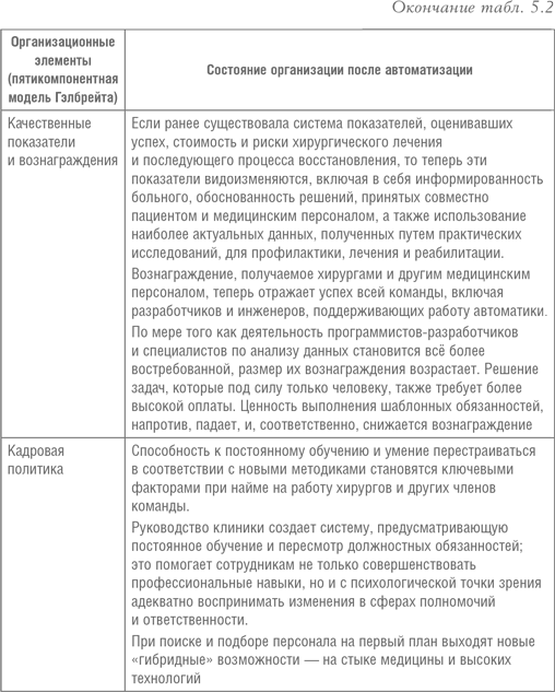 Автоматика не просто изменила работу специалистов в данной области. Она поставила перед руководителями хирургических клиник новые важные задачи. Им предстоит задуматься о правильной организации труда, найти баланс затрат и получаемой прибыли в условиях автоматизации. При этом не исключено, что управленцы будут вынуждены отказаться от некоторых изменений, описанных в главе 4 и в табл. 5.1 и 5.2, поскольку они приведут к серьезным проблемам внутри организации. Быть может, придется замедлить темпы внедрения автоматики, чтобы дать хирургам время осознать свои новые роли и привыкнуть к ним. Наверное, наилучший момент для внедрения автоматизации настанет после того, как клиника привлечет к сотрудничеству программистов и специалистов по искусственному интеллекту, имеющих соответствующий опыт работы: ведь именно они будут наиболее убедительны в беседах с хирургами, которые привыкли к тому, что обладают неограниченной властью и пользуются непререкаемым авторитетом.