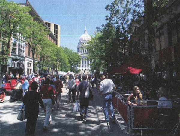 Нужно сказать, что есть один вид неполноценных улиц, по которым действительно приятно проезжать, — это улицы, превращенные в пешеходные зоны (transit malls), где движение разрешено для общественного транспорта, но запрещено для личных автомобилей (в этом и состоит неполноценность). В городах с достаточной плотностью населения transit malls способны стать фантастическими общественными пространствами, потому что притягивают множество пешеходов, велосипедистов и пассажиров автобусов. Николлет-молл в Миннеаполисе, 16-я улица в Денвере, Стейт-стрит в Мэдисоне и Гренвиль-стрит в Ванкувере — все это места, где интерес и человеколюбие дополняют друг друга. Transit malls притягивают велосипедистов и пешеходов возможностью свободно передвигаться по пространству, обычно предоставляемому для мчащихся автомобилей.