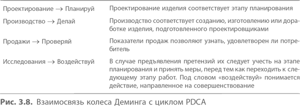 Деминг подчеркивал важность тесной взаимосвязи между исследованиями, проектированием, производством и продажами. Лучшее качество, удовлетворяющее потребителей, обеспечивается непрерывным чередованием этих четырех стадий, служа при этом основным критерием. Позднее концепция непрерывно вращающегося колеса Деминга распространилась на все уровни управления и четыре фазы поворота колеса стали рассматриваться в связи с конкретными действиями руководства (см. рис. 3.8).
