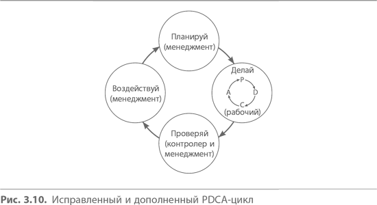 На ранних стадиях применения концепции колеса позиция «проверяй» означала анализ результатов труда рабочих контролерами, а позиция «воздействуй» – корректирующие меры, которые предпринимались при обнаружении ошибок или брака. Таким образом, исходная концепция PDCA базировалась на разделении труда между мастерами, контролерами и рабочими. Однако в ходе ее применения в Японии вскоре обнаружилось, что если PDCA нацелен лишь на корректировку результатов, то этого явно недостаточно. В результате появилась новая концепция PDCA, показанная на рис. 3.10.