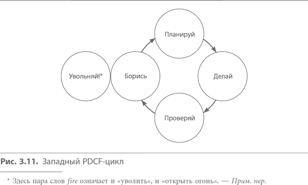 К сожалению, антагонистическая природа производственных отношений в Европе и США ведет к жесткому распределению функций. В результате сформировался цикл, который можно назвать PDCF-циклом (см. рис. 3.11).