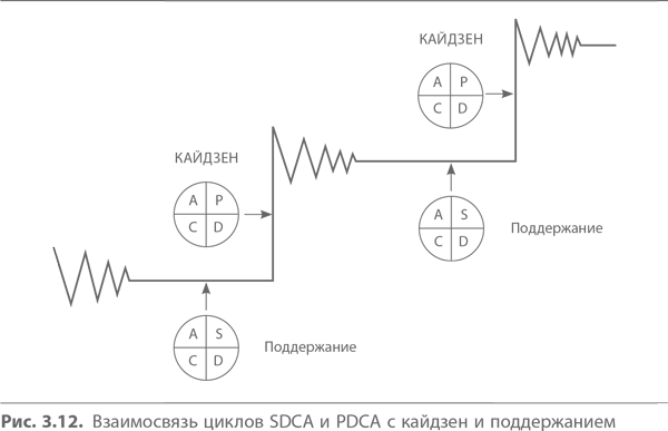 Такой процесс стабилизации часто называют циклом SDCA («стандартизуй – делай – проверяй – воздействуй»). Только когда цикл SDCA работает, мы можем переходить к совершенствованию текущих стандартов при помощи цикла PDCA. Менеджмент должен постоянно следить за согласованной работой SDCA– и PDCA-циклов.