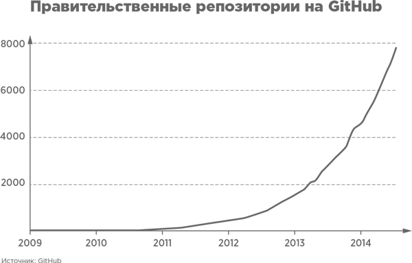 Тогда как платформа GitHub предназначена для программистов, со временем аналогичные платформы появятся для юристов, врачей, журналистов и других профессионалов. GitHub уже расширила свою платформу на область разработки ПО для предприятий с успешно работающей платной бизнес-моделью и в настоящее время начинает работать с государственными, некоммерческими и образовательными организациями. На основе ежемесячной подписки – от 7 до 200 долларов в месяц – GitHub предлагает пользователям сервис для хранения программных кодов. Фонд Андриссена-Хоровица, один из ведущих в мире венчурных фондов, недавно инвестировал в GitHub 100 млн долларов. Это стало самой крупной инвестицией в истории фонда. Чтобы понять причины, посмотрите на график, отражающий использование сервиса GitHub государственными учреждениями по всему миру (обратите внимание на экспоненциальную кривую роста).