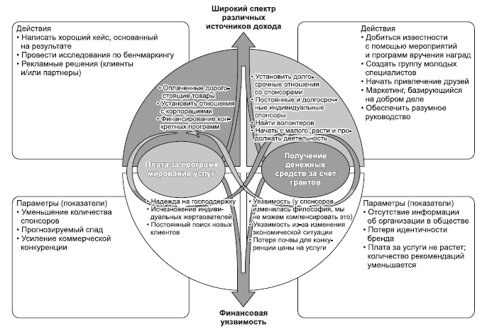 Чтобы осуществить эти крупные проекты, а также продолжать поддерживать более мелкие успешные начинания, организации требовалось сочетание методов, которое расширило бы ее базу источников денежных поступлений. Я встретилась с директором по маркетингу компании Paraquad и составила карту, показанную на рис. 44, – приблизительное видение модели, которая должна была помочь Paraquad работать с парадоксальным мышлением. Эта модель была лишь первым черновым наброском. Она неидеальна, и именно по этой причине я привожу ее здесь. Она содержит достаточный объем релевантной и взаимосвязанной информации, которая позволила компании решить проблему своего развития.