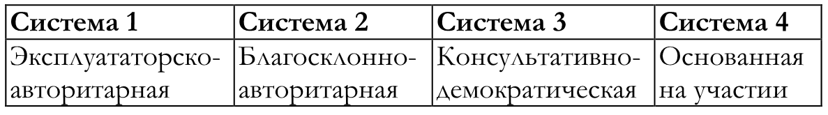 Суммируя эти результаты Р. Лайкерт выделил четыре системы руководства, представленные в таблице 1.