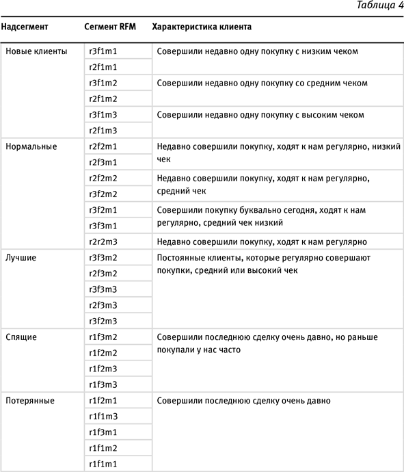 Несложно посчитать, что RFM-анализ делит клиентскую базу на 27 сегментов (табл. 4).