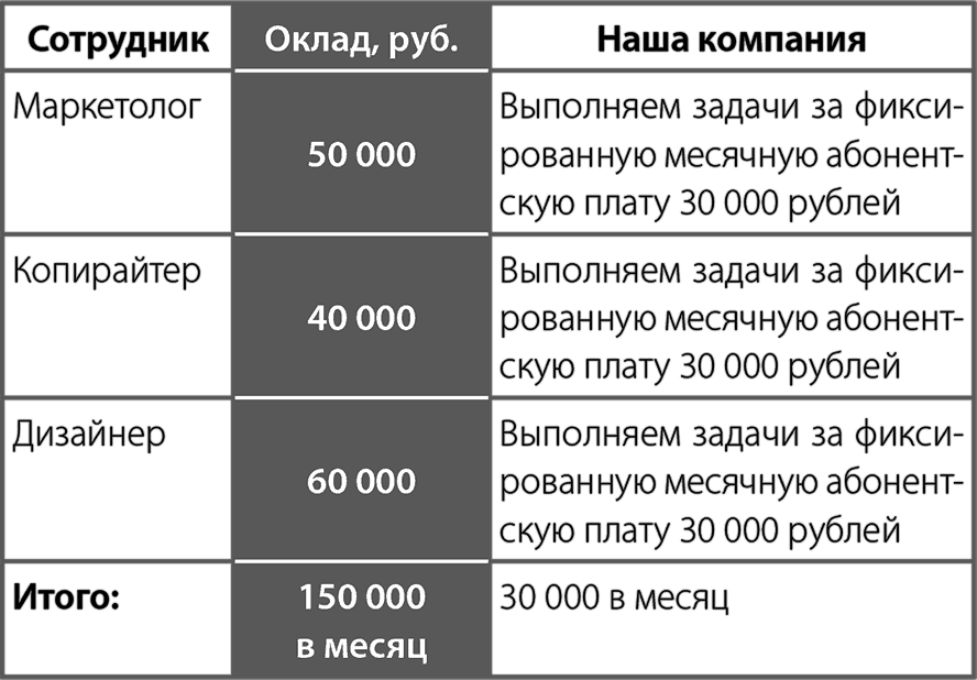 Однажды к нам поступил заказ. Требовалось разработать коммерческое предложение для рекламного агентства, которое предлагало услугу «Внешний отдел маркетинга». Когда специалисты агентства берут на себя все задачи штатного маркетолога. В тексте мы раскрыли все преимущества компании и услуги, а затем – в качестве вишенки на торте – использовали этот прием отстройки от косвенных конкурентов. Как вы понимаете, отстраивались от маркетолога в штате. Мы нарисовали таблицу, где были указаны оклады всех специалистов отдела маркетинга, чьи обязанности мы выполняли. Выглядело это так. Цифры примерные, взяты для демонстрации приема.