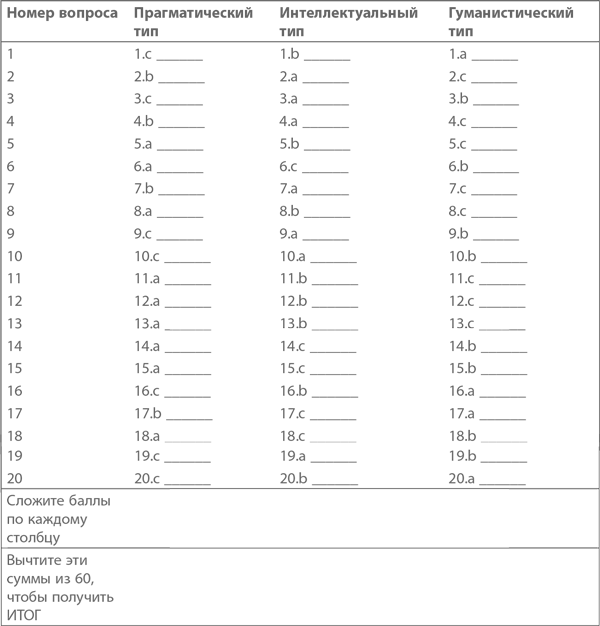 Чтобы подсчитать свой результат, перенесите цифры, которые вы поставили напротив каждого пункта анкеты (то есть начиная с 1a и заканчивая 20c), в соответствующие ячейки следующей таблицы. Затем вычислите сумму по каждому столбцу: это будет ваш промежуточный итог. Наконец, чтобы получить три финальных показателя (три величины, соответствующие основным типам практической философии), необходимо вычесть сумму каждого столбца из числа 60. Наибольшее из трех получившихся в итоге значений скажет вам, какой жизненной философией вы чаще всего руководствуетесь при принятии решений, определении значимости событий, ценности вещей и важности видов деятельности.