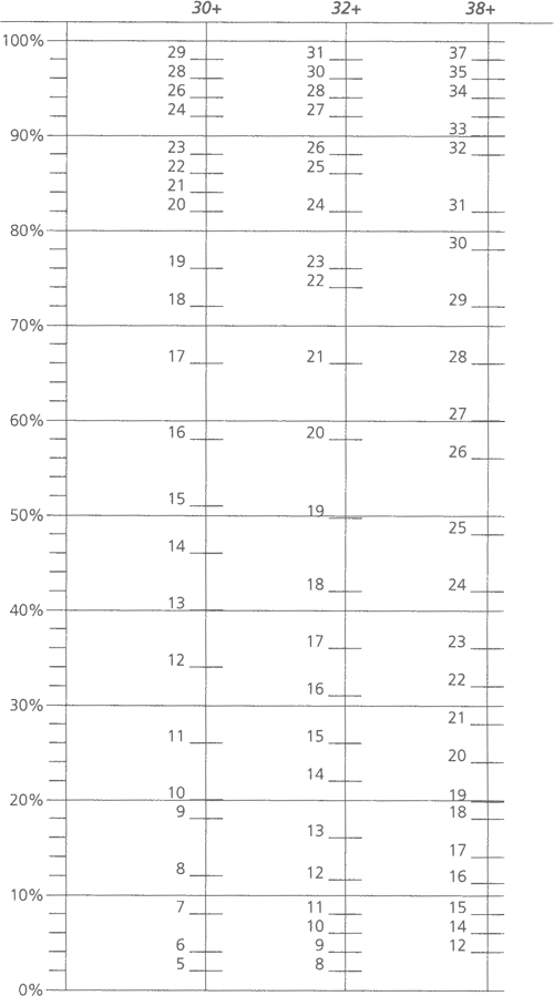 Другой способ – проанализировать результаты с помощью кривой распределения. Используйте для этого таблицу, приведенную ниже. Вы видите три столбца с процентильной шкалой. В каждом из них найдите число, соответствующее вашему итоговому результату по данному типу философской ориентации, и поставьте в этом месте точку. Соедините точки линией.
