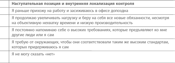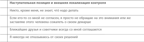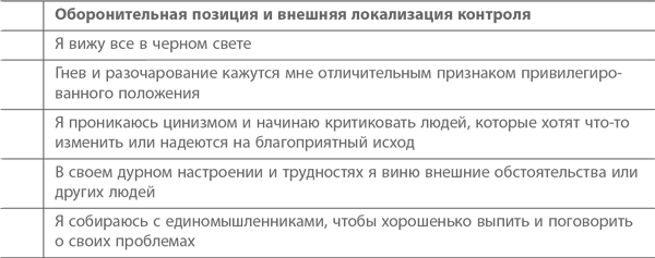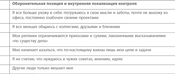 Люди, хронически испытывающие управленческий стресс, склонны прибегать к разного рода психологическим защитам, которые помогают им чувствовать себя более уверенно. Хотя каждый из нас реагирует на стресс по-своему, все формы поведения в сложной ситуации, по сути дела, сводятся к ограниченному набору стратегий. Все зависит от нашего выбора: мы либо видим причину проблемы в себе, либо виним внешние обстоятельства. Аналогично, мы либо смело смотрим в лицо проблеме, либо уклоняемся от ее решения. Соответственно, возможны четыре стратегии преодоления стресса. Немного поясним используемую терминологию. Если мы говорим, о внутренней локализации контроля, это значит, что, оказываясь в сложной ситуации, человек склонен положиться на самого себя. Если же имеет место внешняя локализация контроля, то индивид либо слишком сильно зависит от других, либо приписывает ответственность за происходящие события внешним силам (или возлагает вину на окружающих). Далее, если человек занимает наступательную позицию, значит, он стремится встретиться с проблемой лицом к лицу и как можно скорее предпринять какие-то действия ради ее решения. Если же он предпочитает оборонительную позицию, то он нередко медлит с ответом, не решается взяться за решение проблемы или даже попросту ее игнорирует. Ниже вашему вниманию предлагается упражнение, которое поможет определить, какие защитные реакции вы обычно демонстрируете и как ваше поведение влияет на вас лично и окружающих людей.