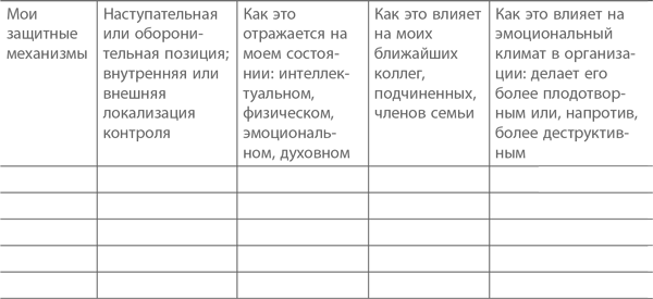 Этап 2: Перечислите пять основных защитных механизмов, которые вы чаще всего используете. Проанализируйте, какой тип реакции характерен для вас больше: наступательный или оборонительный. Подумайте, склонны ли вы видеть причину происходящего в собственных действиях/решениях или обычно возлагаете вину на других людей/внешние обстоятельства (см. второй столбец). Затем (в третьем, четвертом и пятом столбцах) напишите несколько слов о том, как эти привычные способы поведения влияют на вас, а также на ваших коллег / ваш рабочий коллектив / организацию.