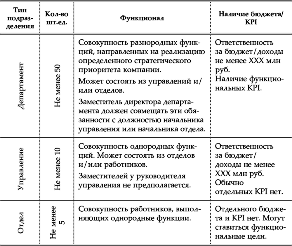 – количество и виды структурных подразделений, критерии отнесения подразделения к тому или иному типу, соотношение front office и back office,