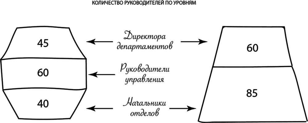 В одной из розничных компаний, где я работала, осуществлялся масштабный проект по трансформации оргструктуры центрального офиса компании из «бочки» в «пирамиду». «Бочкой» мы назвали ее в связи с тем, что начальников отделов в компании было намного меньше, чем руководителей управлений (рисунок 4). Это произошло в результате того, что многие начальники отделов пролоббировали повышение своего статуса до руководителя управления, а представители службы персонала не управляли данным процессом. Между тем организационное развитие напоминает уход за садом. Если не косить газон и не подстригать деревья, через несколько лет сад разрастется стихийным образом, и более сильные и живучие растения обязательно захватят дополнительную площадь.