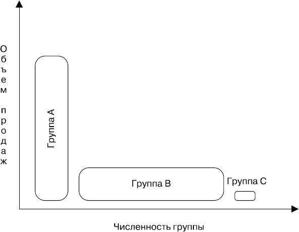 Наиболее простая и обобщенная классификация клиентов – это АВС-сегментация (рис. 6.10). Она делит клиентов по объему закупок. Так, А-клиенты – это клиенты с наиболее крупным объемом продаж. Это «золотые» клиенты, составляющие самую немногочисленную по количеству группу. Как правило, это 20 % клиентов, на которых достигается 80 % продаж. Группа В – это среднестатистические клиенты, ключевые. Это самая многочисленная группа. Они приносят свыше 10 % продаж. Вам выгодно с ними работать, но объемы продаж каждому из них отдельно невысоки. Группа С – это наиболее мелкие с точки зрения продаж клиенты, которые покупают редко и на небольшие суммы. Часто вы несете на них больше расходов, например на логистике, чем получаете от них дохода.