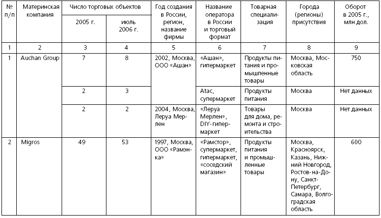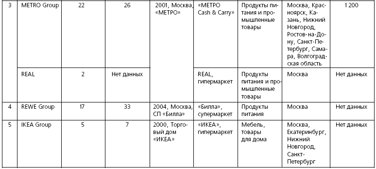Несмотря на то что приход транснациональных торговых сетей в Россию ускорил процесс концентрации национального торгового капитала, доля иностранцев на розничном рынке незначительна и наиболее заметна в крупных форматах: «cash & carry» (METRO Cash & Carry) и гипермаркеты компании Auchan Group. В 2006 г. на столичный рынок вышли французский гипермаркет спортивной одежды и инвентаря Decatlon, германская сеть бытовой техники и электроники Media Markt (Metro Group) и продуктовых гипермаркетов Globus (Hiperglobus), британская сеть универмагов Debenhams.
