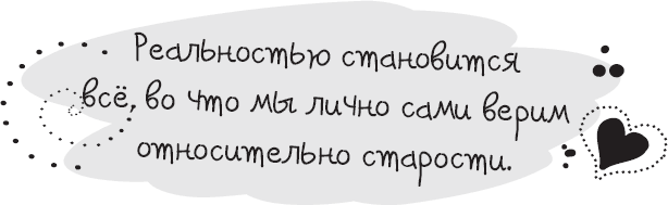Это вполне достижимо. На протяжении жизни одного или двух поколений для большинства из нас станет привычным доживать до значительно более старшего возраста. Раньше в среднем доживали до сорока семи лет. Теперь это уже неактуально. Теперь можно спокойно дожить до семидесяти пяти лет. Мне самой уже перевалит за восемьдесят четыре. На протяжении жизни многих поколений наш возраст в годах, прожитых на этой планете, диктовал нам, как себя чувствовать и как себя вести. Как и с любым другим аспектом нашей жизни, реальностью становится всё, во что мы лично сами верим относительно старости. Так вот, уже пора изменить эти убеждения о пожилом возрасте! Когда я оглядываюсь вокруг и вижу испуганных, слабых, беспомощных стариков или пожилых людей, я говорю сама себе: «Так быть не должно!» Многие из нас уже научились тому, что, изменив мышление, можно изменить и жизнь.