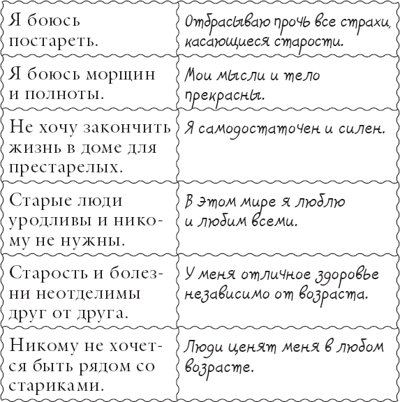Я в единении с жизнью. В жизни я обретаю любовь и поддержку. Поэтому я заявляю, что я умиротворен и радуюсь этой жизни в любом возрасте. Каждый день нов, отличается от прежних, сулит больше радостей и удовольствия. У меня активная позиция в этом мире. Я подобен студенту с неизбывной тягой к знаниям. Я забочусь о здоровье своего организма. Для меня важен и уход за телом. Я делаю осознанный выбор в пользу мыслей, которые могут меня осчастливить. У меня тесные духовные связи с окружающими, которые поддерживают меня все время. Я не ассоциирую себя со своими родителями, не отождествляю себя с их старостью и смертью, независимо от того, идет ли речь об их возрасте или о том, как они умерли. Я уникальная, неповторимая личность. Я выбираю жизнь, полную надежды вплоть до последнего дня пребывания на этой планете. Я в ладу с самим собой. Я люблю жизнь в любых проявлениях. В этом и есть истина моего бытия. Я приемлю ее именно такой. У меня в жизни все обстоит благополучно.