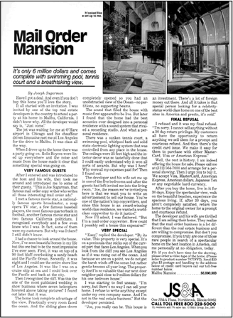 После успеха с самолетом у меня появилась возможность действительно попробовать расширить представления о посылочной торговле. Можно ли таким способом продать дом стоимостью 6 млн долларов? Можно ли с помощью одного рекламного показа найти одного клиента – ведь так же, как и с моим самолетом, мне нужен был лишь один клиент.