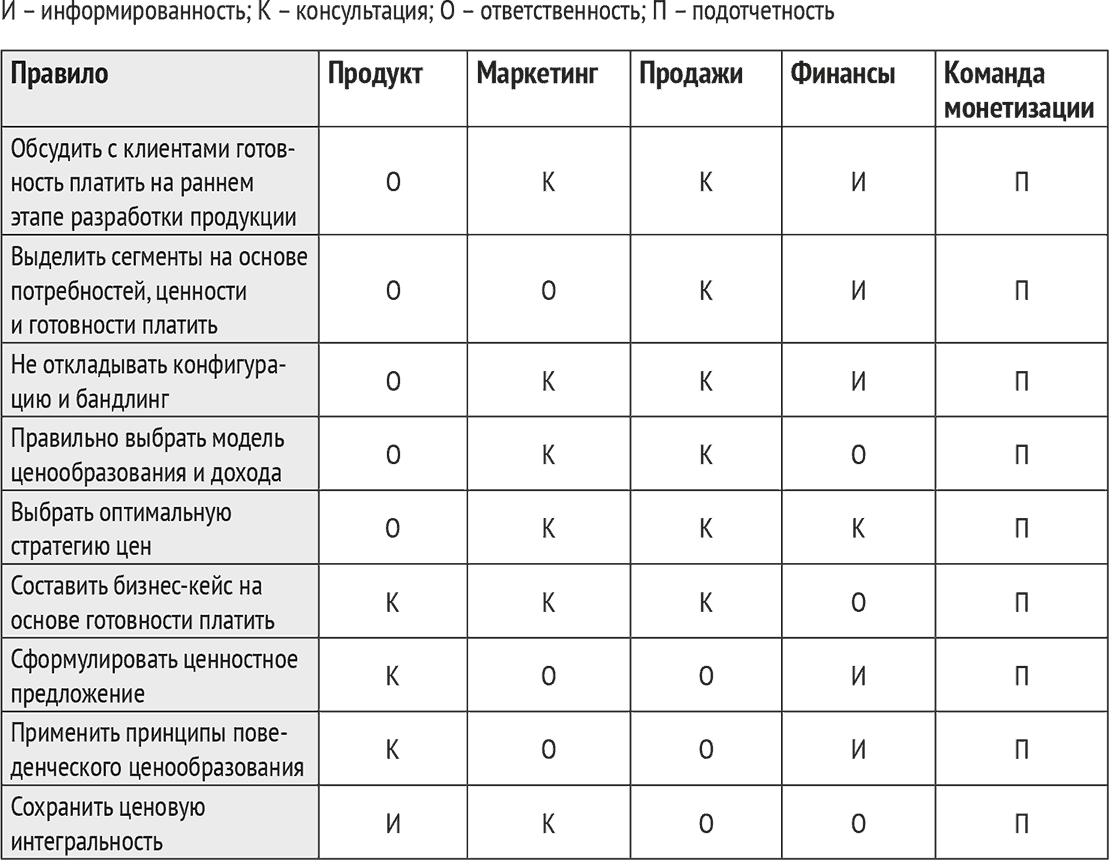 Таблица 14. Обязанности и ответственность по девяти правилам монетизации инноваций