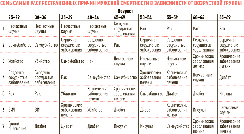 В этой таблице, обобщающей опыт миллионов покойников, приведены самые вероятные причины твоей смерти в зависимости от возраста – по данным Центров контроля и профилактики заболеваемости. (Ну как, мне удалось завладеть твоим вниманием?) На следующих страницах ты найдешь профилактические советы.